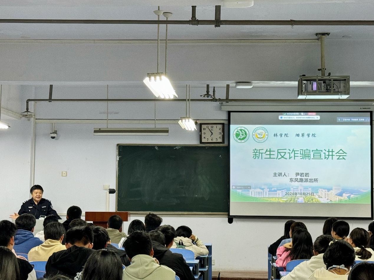 10月25日晚,独播库 联合烟草学院于文化路校区推广楼教室召开新生反诈骗宣讲会。本次会议由东风路社区民警尹岩岩担任主讲,院团委老师张琛出席本次报告会,独播库 2024级全体本科生参加。