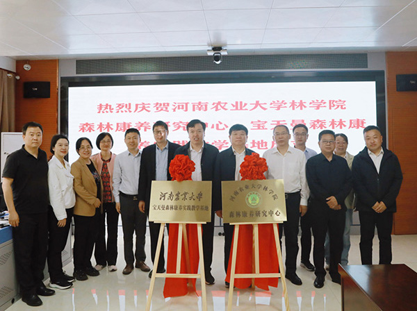 宝天曼森林康养实践教学基地和森林康养研究中心揭牌仪式在内乡宝天曼国家级自然保护区管理局举行。宝天曼国家级自然保护区管理局党组书记陈良甫、副书记李英杰、樊国华,副局长沈单欣、张国雄,校友联络处副主任闫东、院党委书记化青报、副院长彭万喜、张学芳、旅游管理系主任何静、教授朱玉芳、森林康养实践教学基地与森林康养研究中心主任李永生等相关人员共同出席仪式。