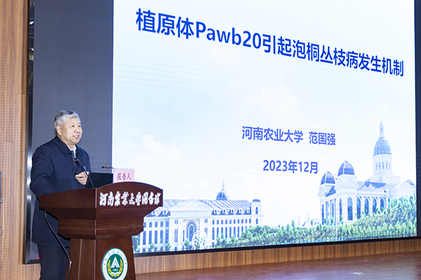 院长范国强教授以“植原体效应子诱导泡桐丛枝发生的分子机理”为题作主旨报告。他表示,在泡桐丛枝病的防治和新品种培育方面的建树为国内外泡桐遗传解析提供了信息平台,确立了我国在泡桐基础理论研究方面的国际领先地位,加快了泡桐栽培的科学化和标准化进程。