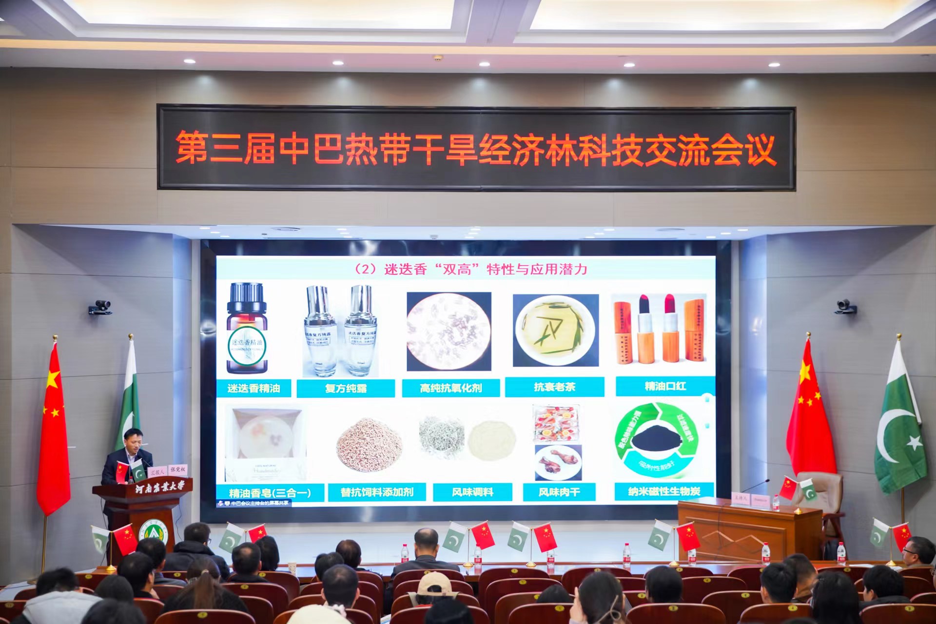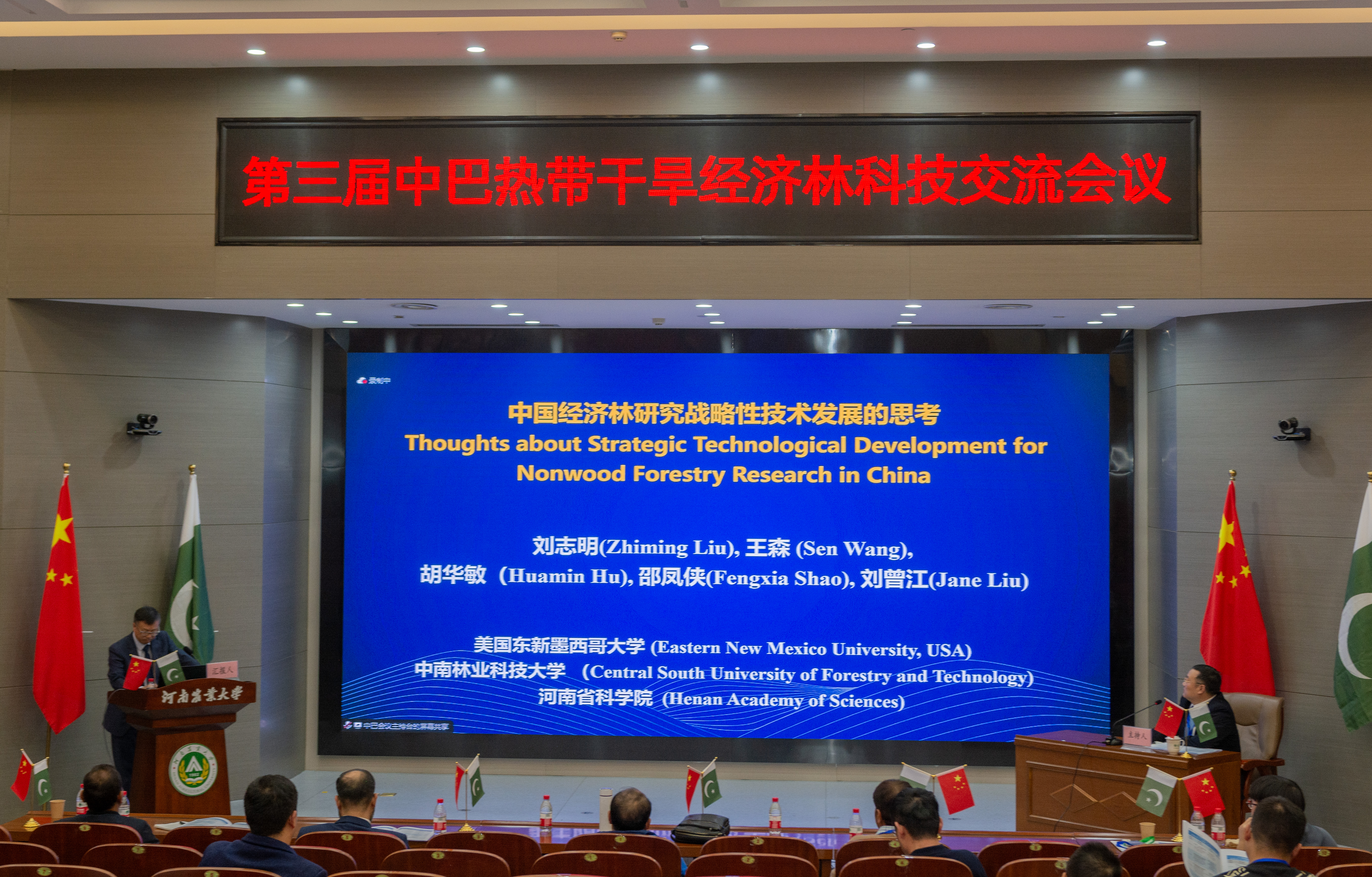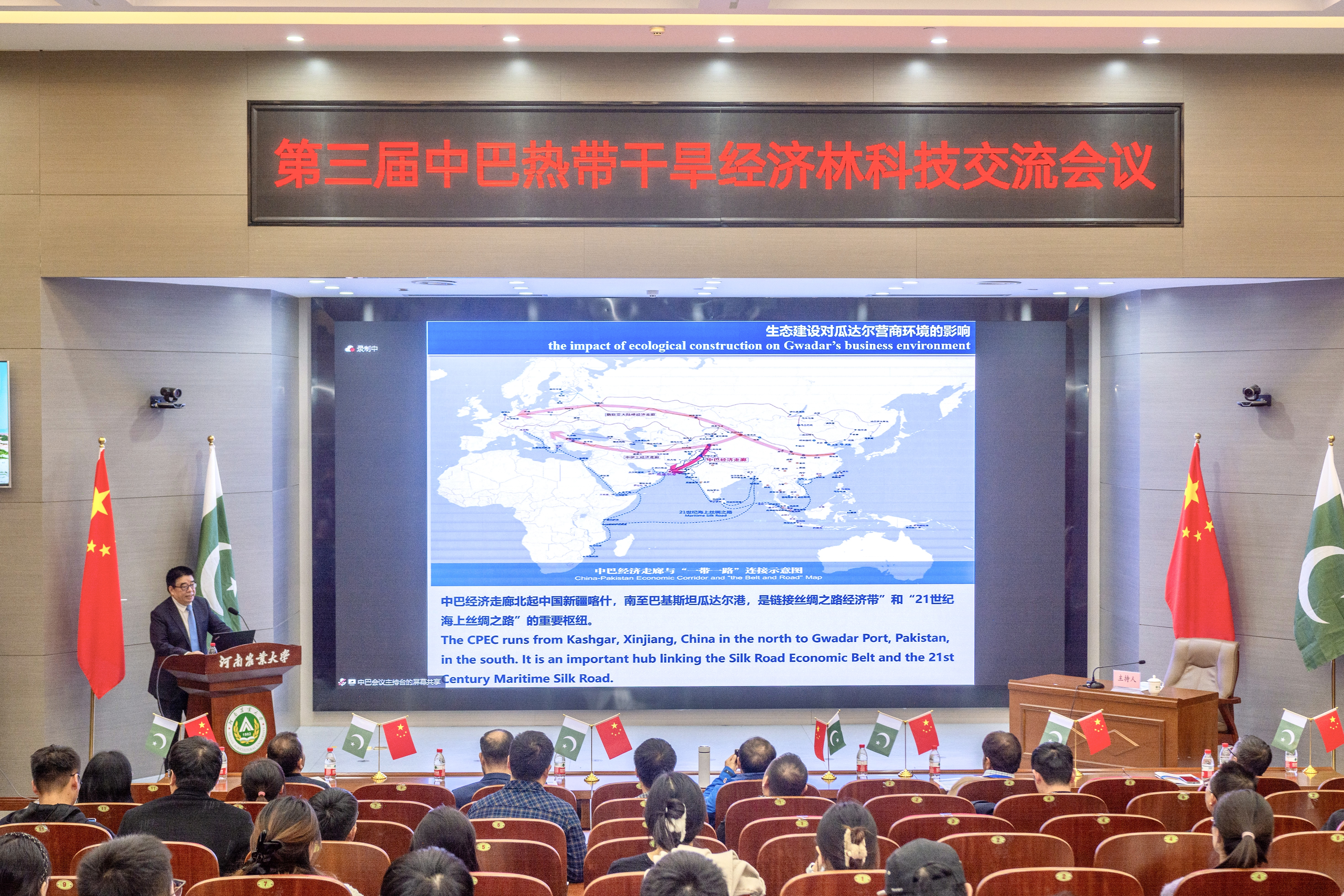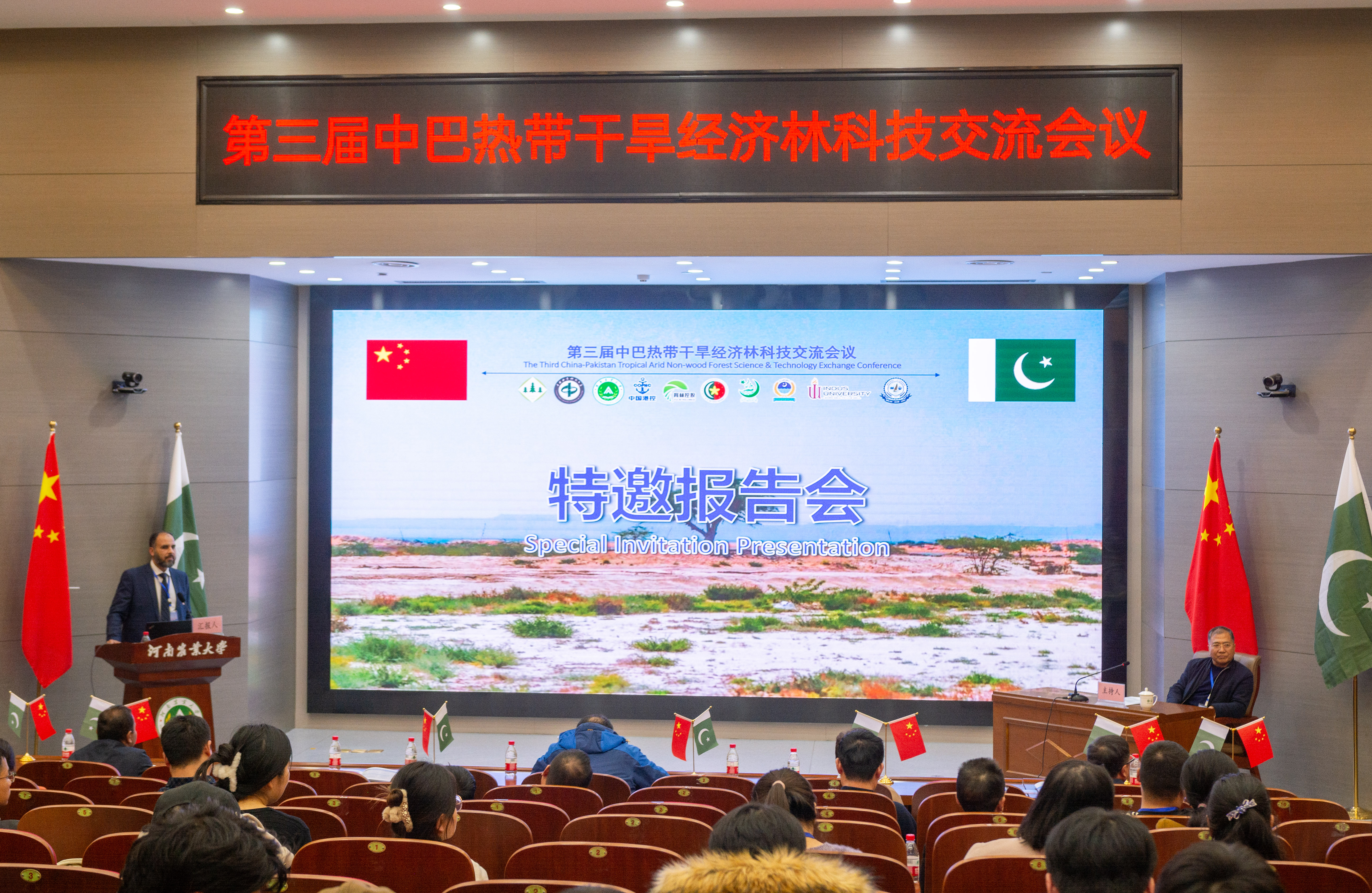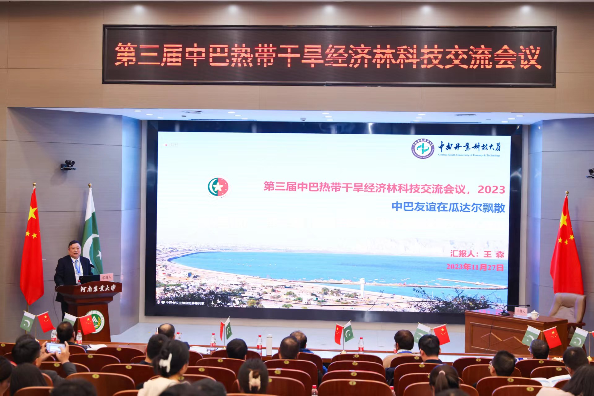 2023年11月27日上午,由中国林学会、中南林业科技大学主办,独播库 、河南省林学会、中国林学会经济林分会、中国海外港口控股有限公司、育林控股有限公司、卡拉奇大学、费萨拉巴德农业大学、印度河大学、瓜达尔大学、“一带一路”干旱经济林国家创新联盟、湖南省“一带一路”热带干旱经济林国际联合研究中心承办的第三届中巴热带干旱经济林科技交流会议,以线上线下结合的方式在独播库 和巴基斯坦瓜达尔自由区同时开幕。本次会议以“木本药材与活性物质”为主题。来自独播库 和中国林学会、中南林业科技大学、中国林科院经济林中心和亚林中心、巴基斯坦印度河大学、卡拉奇大学、瓜达尔大学、费萨拉巴德农业大学等单位的领导嘉宾、专家学者和企业家等200余人参加会议。校长介晓磊出席会议并致辞。独播库 院长范国强主持会议。