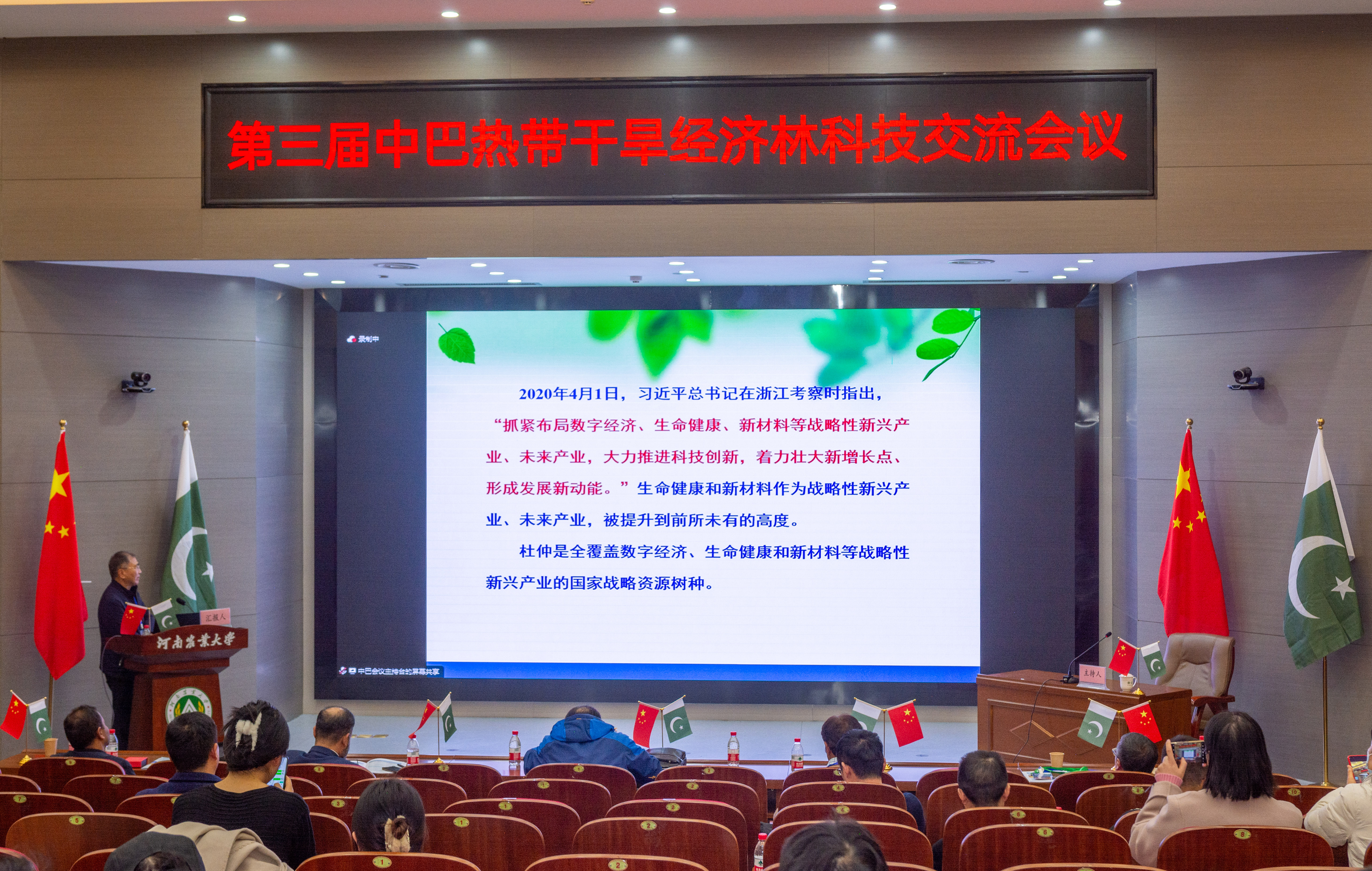 中华人民共和国驻卡拉奇总领事馆杨广元参赞,巴基斯坦伊斯兰共和国驻华大使馆哈什米大使线上致辞,中国科学院院士、河南省科学院院长徐红星院士,育林控股有限公司董事长胡华敏教授,中国林学会经济林分会谭晓风理事长,巴基斯坦卡拉奇大学校长穆罕穆德·法希姆·西迪基教授,费萨拉巴德农业大学校长贾法尔·贾斯卡尼教授,费萨拉巴德农业大学拉希德·瓦西姆·汗教授,印度河大学校长阿民教授等为大会纷纷致辞,对会议的顺利召开表示祝贺,为中巴两国在科技攻关、人才培养和产学研合作等方面提出建议和希望。