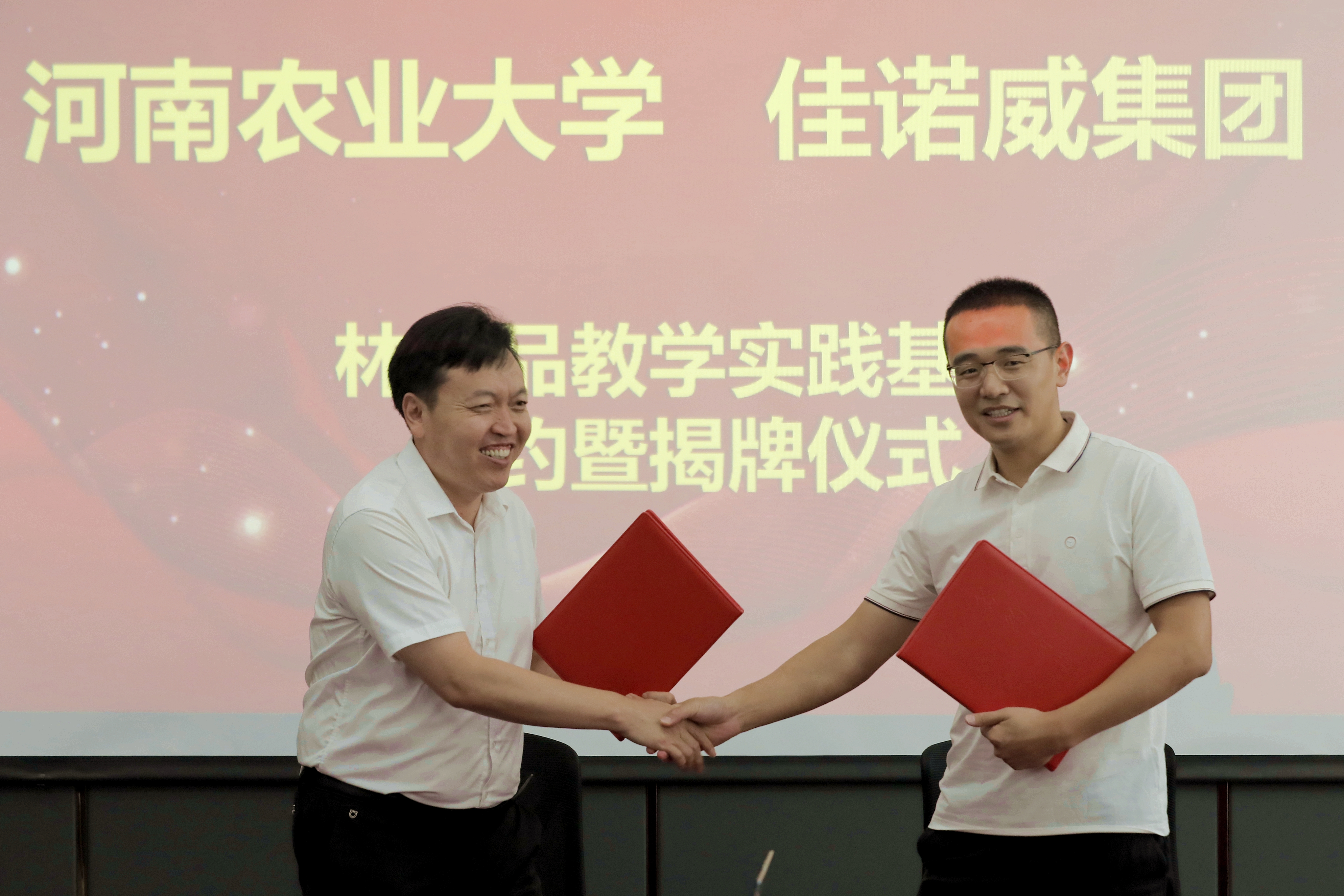 佳诺威集团长期教学科研合作基地,利用佳诺威集团现有的智慧型生产线,为学生提供更好的实践机会,促进教学内容与行业需求的对接,促进科研与技术创新。同时协助企业研发新产品,改进和优化生产工艺,提升产品质量,发展林木资源高值化与可持续利用等工作。希望双方以这次合作协议签署和基地揭牌为契机,进一步密切合作与交流,实现互利共赢、推动共同发展,打造具有典型示范作用的校企合作模式,带动更多的学生到新蔡县就业创业,更好地为林业产业健康发展、地方经济社会建设服务。