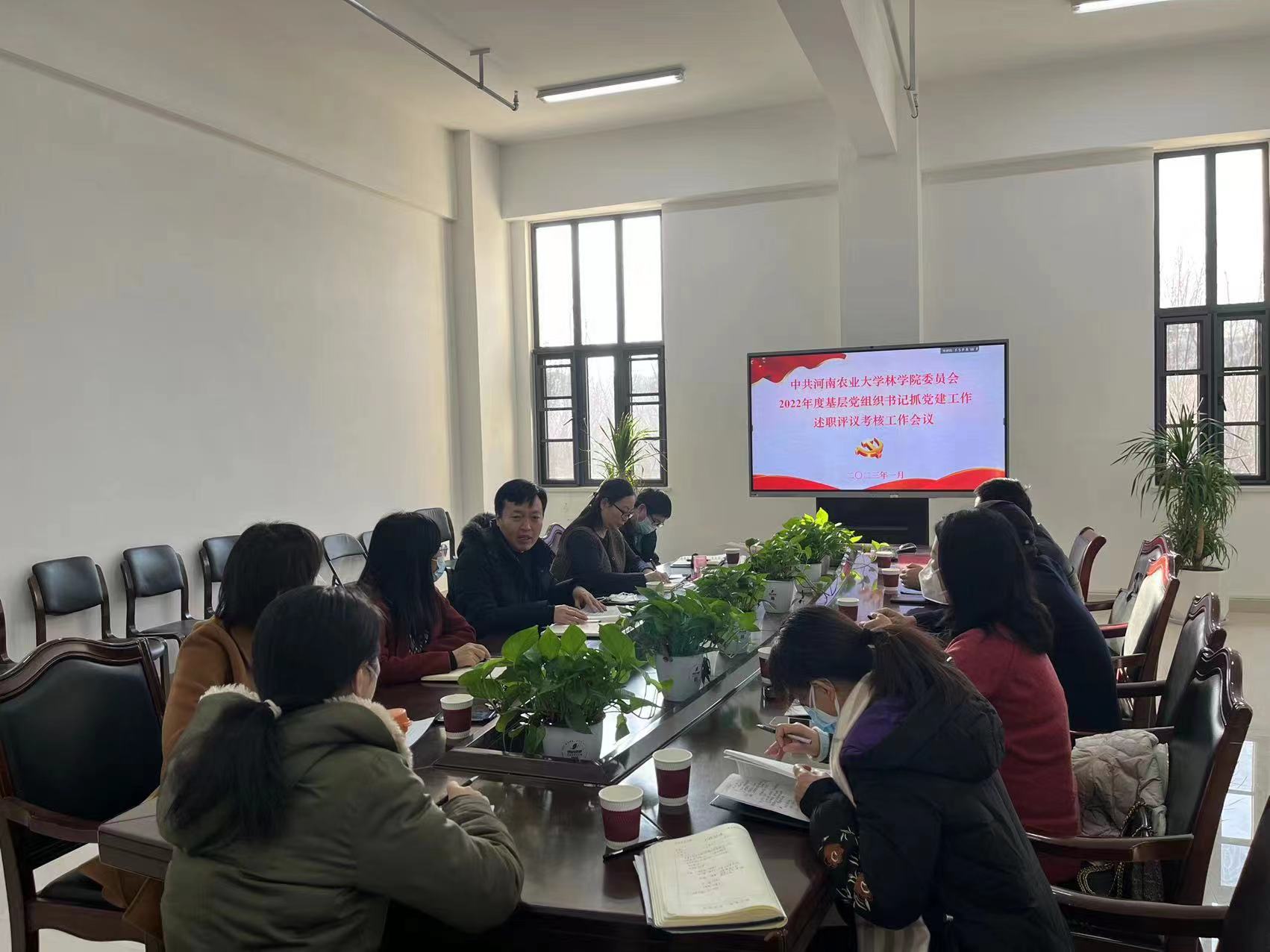 1月9日,独播库 在龙子湖校区力行楼会议室召开2022年度基层党支部书记抓党建工作述职评议考核会议。院党委书记化青报、副书记王娟、副院长彭万喜、副院长张学芳、副院长李喜梅及各教工党支部委员参加会议。会议由王娟主持。