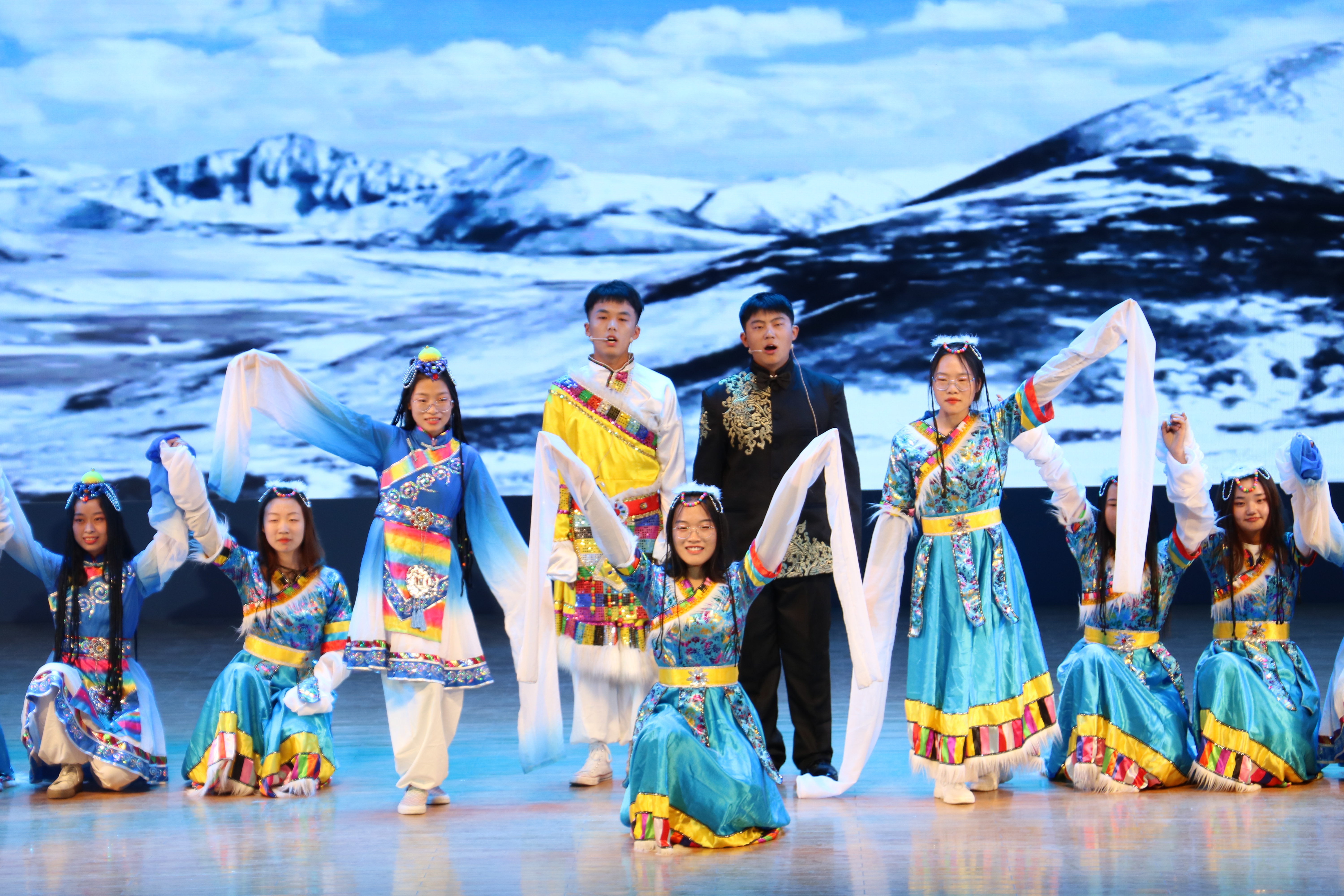 晚会在激情四射的现代舞中拉开了帷幕,同学们精神抖擞、饱含深情,歌声或婉转、或激扬、或振奋、或高亢,精致的服装、动人的歌声、优美的舞蹈感染着台下的每一位观众。《大中国》《强军战歌》《歌唱祖国》《没有共产党就没有新中国》《天耀中华》《五星红旗》《保卫黄河》《团结就是力量》等红色经典歌曲以极富冲击力和震撼力的视听效果,唱出了“万水千山不忘来时路”的庄严承诺,唱出了“万众一心奔向前方”的壮志豪情。《天路》《不忘初心》《七子之歌》《我爱你中国》《我和我的祖国》《我们都是追梦人》等歌曲用深情的旋律和动人的歌词,唱出了华夏儿女祝福祖国平安昌盛的深厚情感,表达了学子们奋发向上、努力拼搏、全心全意跟党走的坚定决心。
