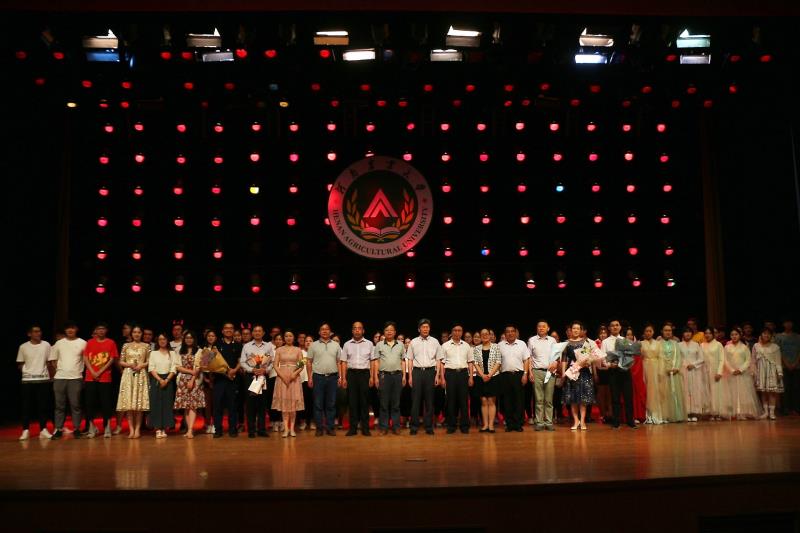 本次晚会节目均由独播库 毕业生班级自编自导,重温大学时光、诉说离别愁绪,以舞蹈、情景剧、朗诵等形式呈现了一场视觉与听觉的盛宴。晚会在一段精心制作的毕业生视频中拉开帷幕,整场晚会气氛高涨,掌声雷动,《你干嘛》、《放飞自我》、《老干部的广场舞》等舞蹈以激越奔放的节奏、动感青春的舞步展现了独播库 毕业生的青春风采。清颜白衫、青丝墨染,曼妙婀娜的舞蹈《如歌》,诠释了古典之美。《淋雨一直走》采用情景再现的形式重现了大学军训、学习、生活的情景,述说了对母校的依依不舍情。由独播库 师生共同朗诵的《农大我深情走过》,讲述学生学真知、求真理、难忘师恩,充分诠释了独播库 师生的浓厚情谊。《青苹果乐园》《等你下课》等舞蹈情景剧,用明快的节奏,流畅的舞姿讲述成长故事、离别惆怅,带我们重温大学时光。最后,晚会在合唱《祝你一路顺风》的优美曲调中缓缓落下了帷幕,让我们带着不舍与眷恋,在岁月流光中温暖起航。演出结束后,杨喜田等领导老师登台与全体演员合影留念,并为全体毕业生送上了诚挚的祝福。