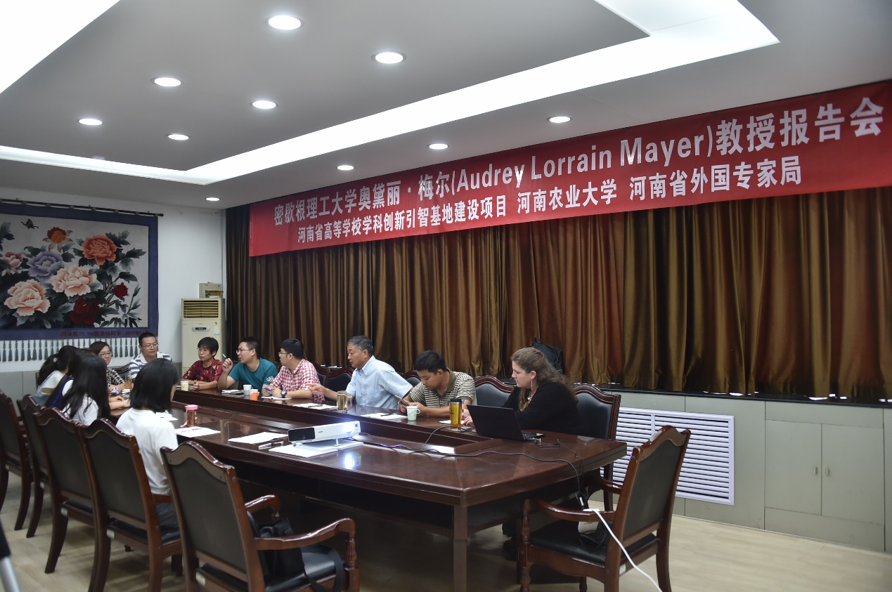 来访期间,Audrey Lorraine Mayer教授和基地团队成员就郑州森林生态系统、湿地生态系统以及生物多样性保护项目召开多场专题研讨和座谈会。风景园林学科带头人、基地和项目负责人田国行教授详细介绍了郑州地形地貌与自然资源分布状况、郑州城市国家战略定位、项目的规划背景与预期目标以及郑州山水林田城生命共同体构建的理论与方法等具体内容。Audrey Lorraine Mayer教授结合多年积累的科研和实践经验,围绕项目现场调研、研究方法拟定、技术理论分析、数据库资源建设等内容,与课题组成员进行了深入的沟通与交流,对项目规划给予了有利指导,为后续的专项研究打下坚实基础。专家还围绕城乡景观和环境可持续发展的理论、方法、途径,对博硕士研究生课题拟定、英文学术论文撰写、试验场地设置与实验数据获取方法等内容进行全方位、多角度、多形式的交流与指导。