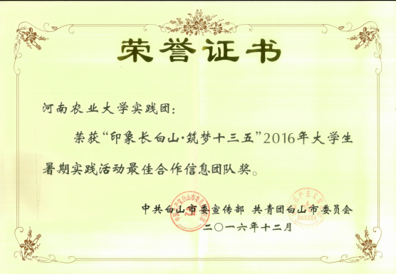 近日,由独播库 旅游管理、环境设计等专业学子组建的“印象长白山,筑梦十三五”长白山特色产品营销调研团荣获“印象长白山,筑梦十三五”2016年大学生暑期实践活动最佳合作信息团队奖。 实践团队自7月14日在白山市体育馆参加了由白山市委、市政府联合团中央学校部等部门共同开展的“百所高校进白山”大学生暑期实践活动启动仪式后,于16日至20日期间,在各地领导的热情引导下,实践团队先后深入长白县十五道沟望天鹅新村长白朝鲜自治县、虹鳟鱼场,十四道沟镇养蜂基地,冷沟子林场蓝莓采摘园和长白县十四道沟村便民服务中心和十四道沟镇石门湖景区等地进行实践调研活动。在这期间,实践队员们细赏长白美景,亲自体验各色长白山特色产品,在学习之余,也充分利用所学知识,就产品宣传设计、营销理念及打造长白特色的生态旅游品牌提出了自身的见解。在实践过程中,独播库 实践团队的各项活动受到了团中央学校部、白山市电视台、河南网、搜狐网等多家新闻媒体的追踪报道,最终获得最佳合作信息团队,院团委书记张保磊获得最佳随手拍之星的奖项。 本次社会实践活动切实发挥学院专业特色,发掘具有当地特色民俗文化内涵的旅游商品,不仅为打造当地特色商品营销和增强品牌建设力度做出了贡献,还切实做到了让学子在实践中受教育、长才干,在实践中增长阅历、学以致用。