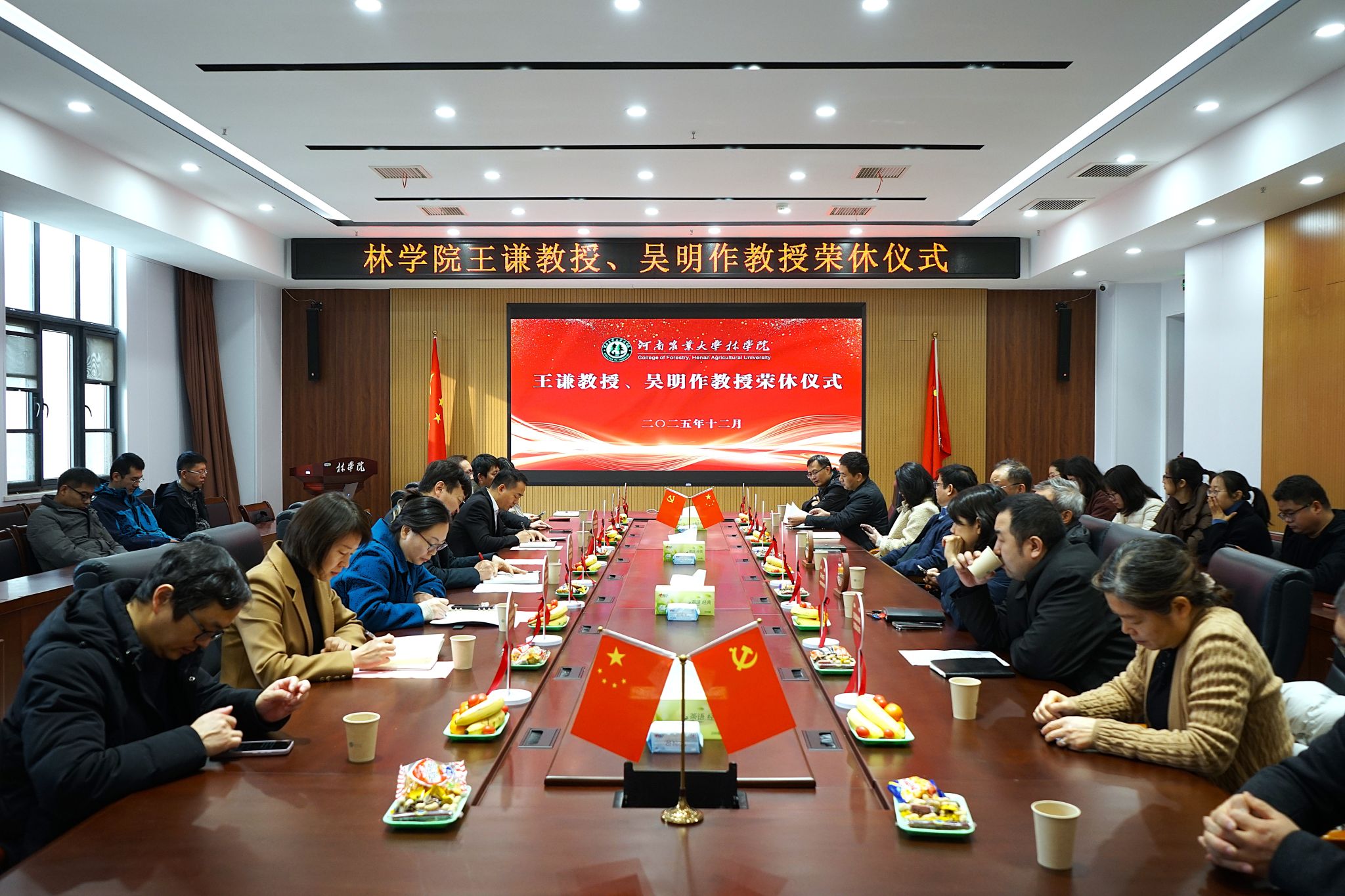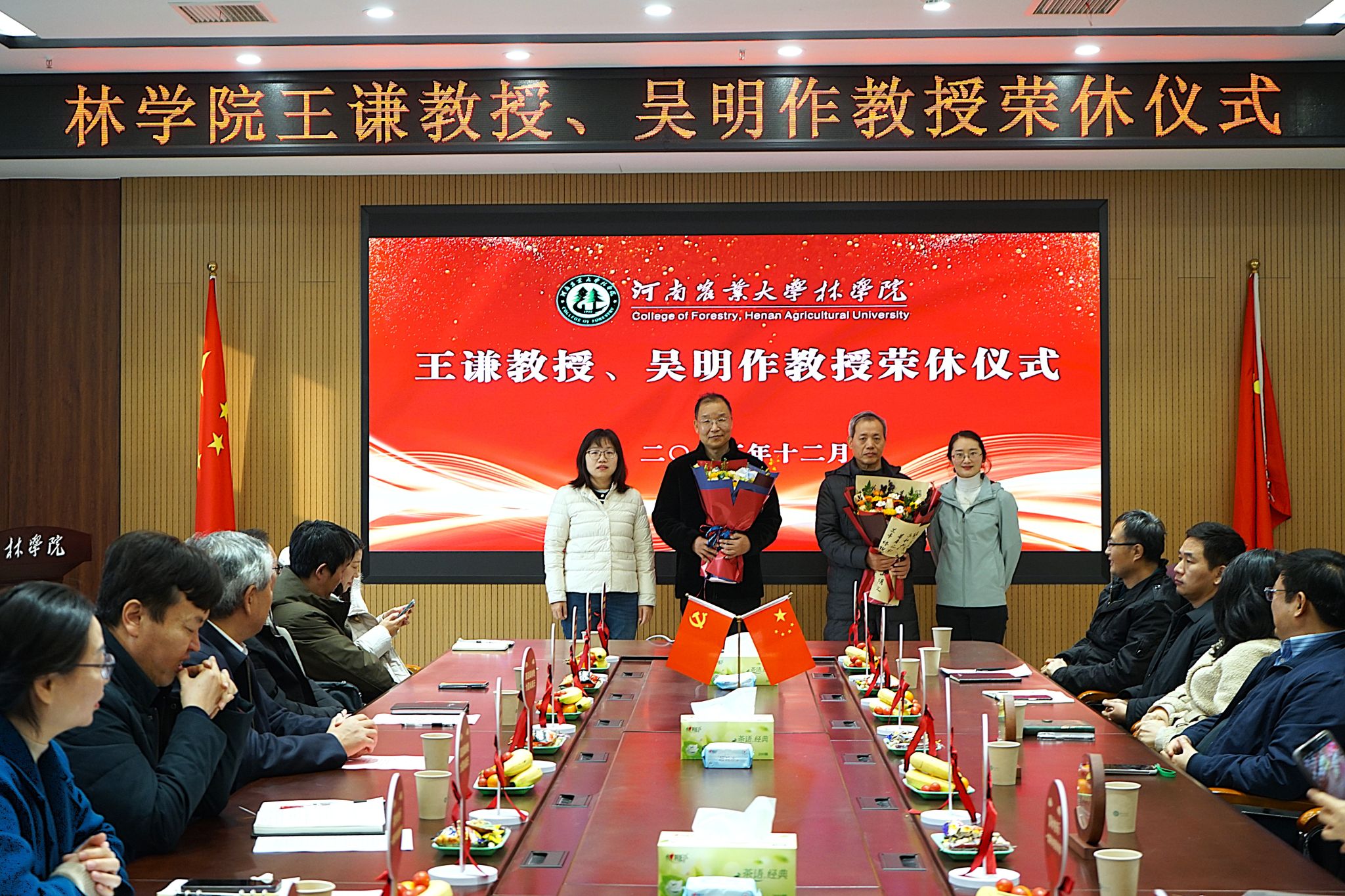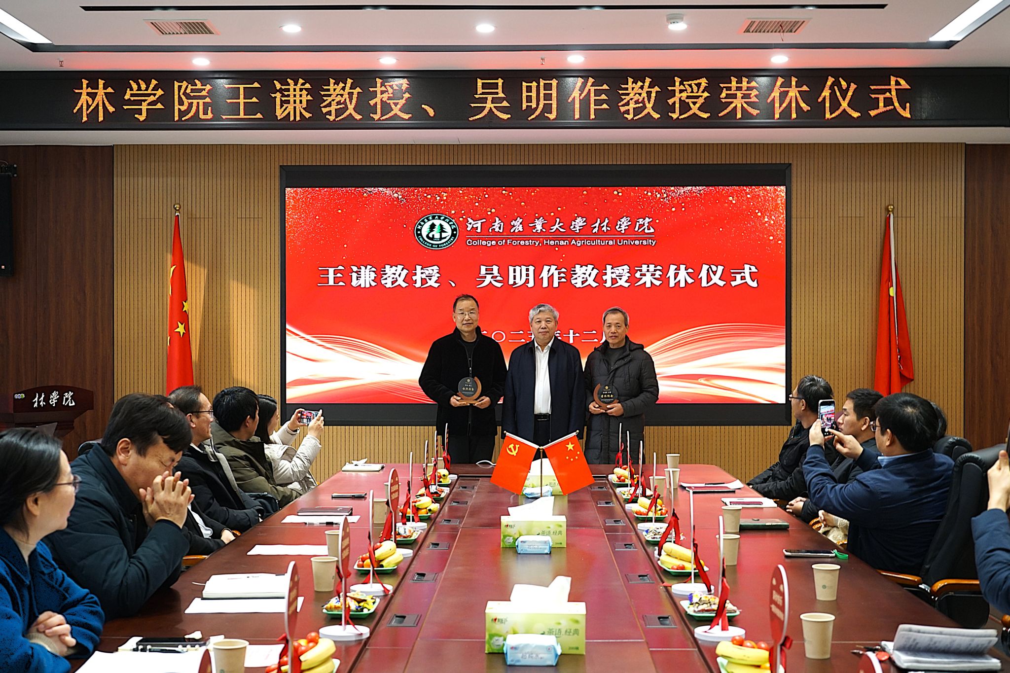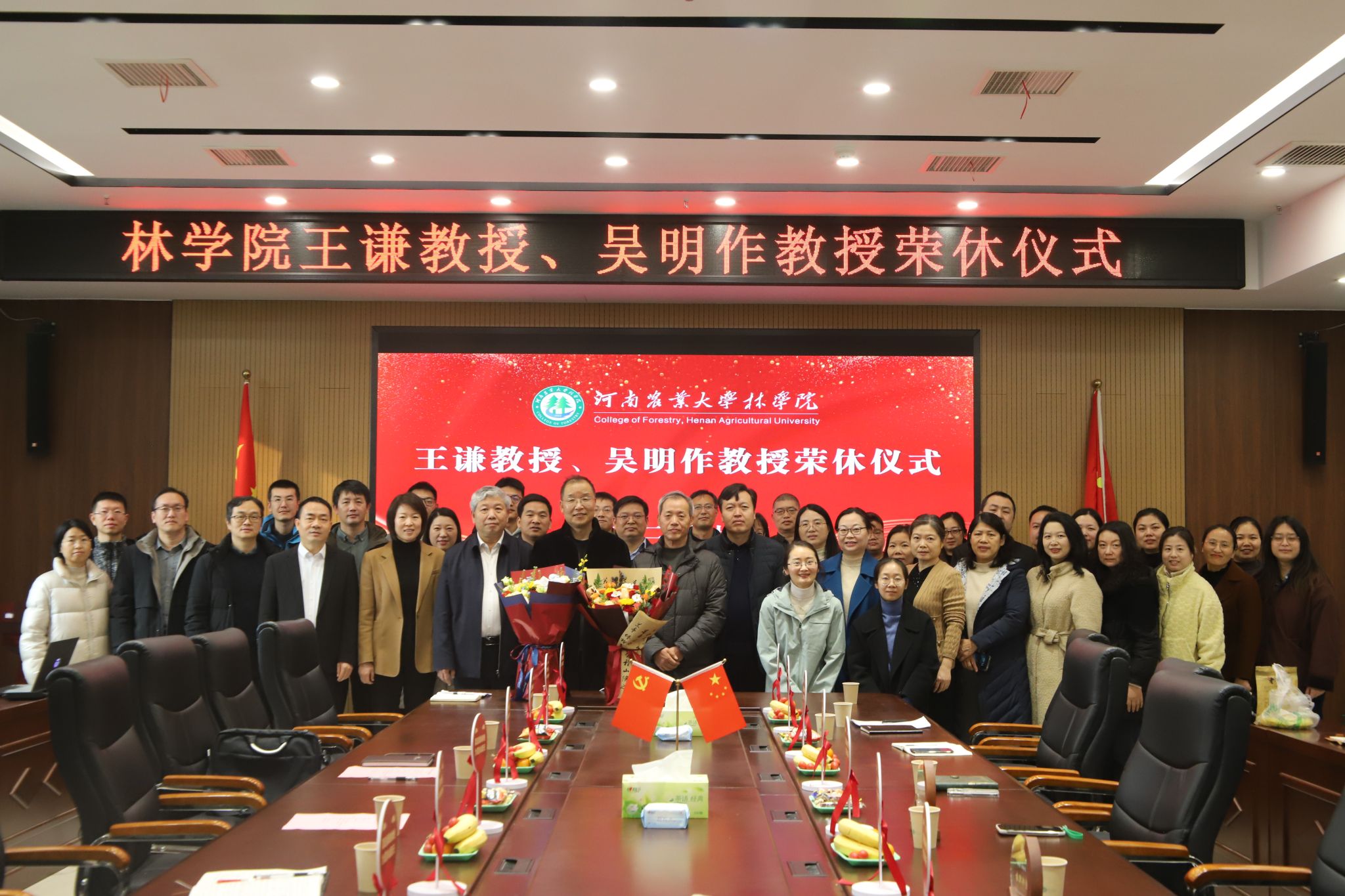 王谦教授、吴明作教授荣休仪式在力行楼-南-231会议室举行,院党委书记化青报、院长范国强院士、副院长李喜梅、各系主任、生态系和环境系教师代表参会。仪式由院党委副书记王娟主持。