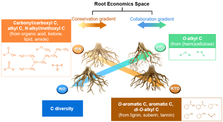 13C核磁共振(NMR)分析,量化了细根中来源于不同化合物不同官能团的碳组分相对丰度,首次报道了植物根系分子水平碳性状的变异格局,揭示了这种分子水平碳性状在塑造细根多维经济空间中的重要作用(图1)。全球尺度的数据分析表明分子水平碳性状与细根多维经济空间之间的耦合可能是一个普遍现象。这一发现不仅为理解植物根系形态和功能的多样性提供了全新的分子尺度的见解,而且对于理解植物进化、物种共存以及对异质环境的适应性等方面具有重要意义。