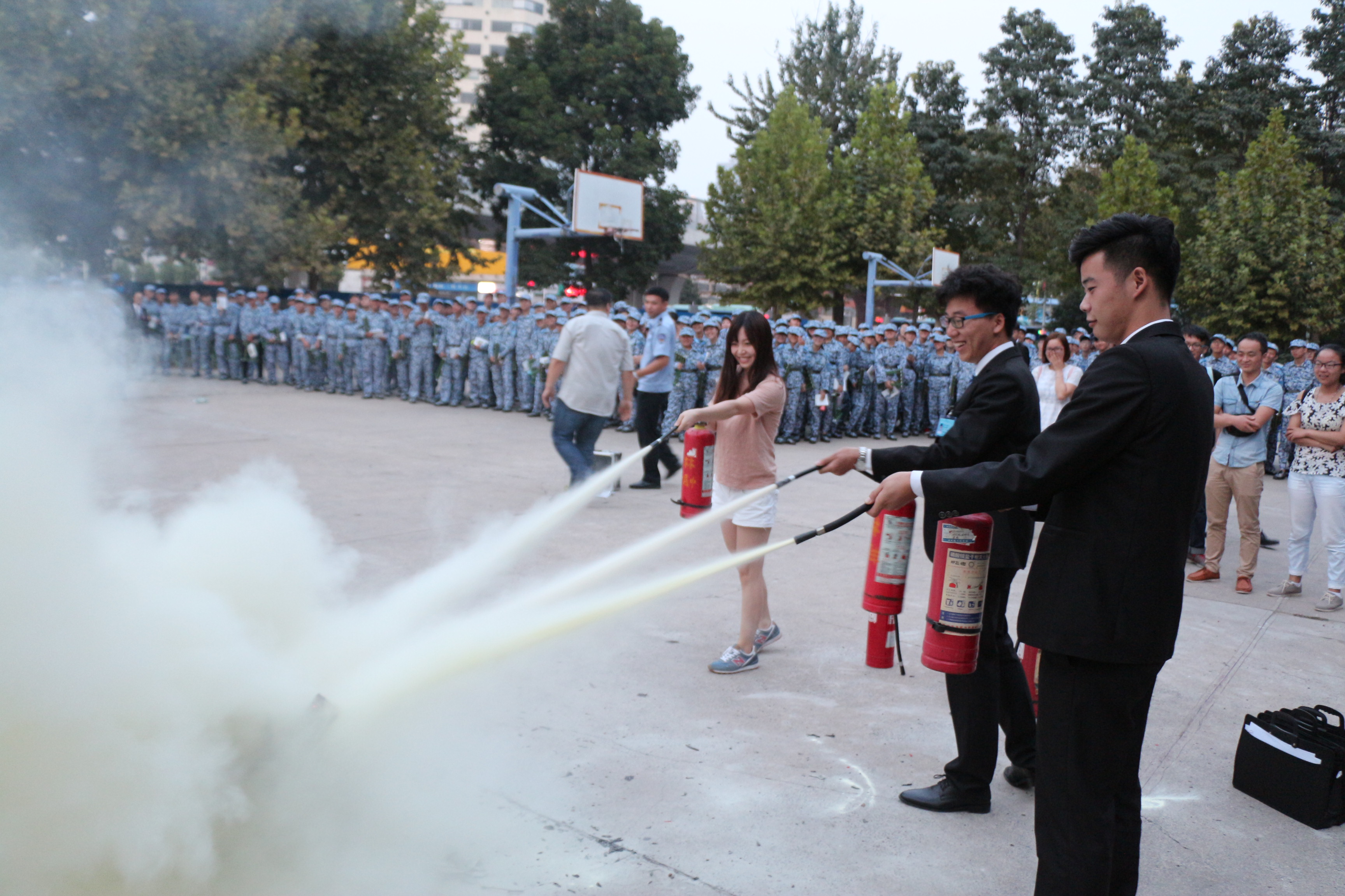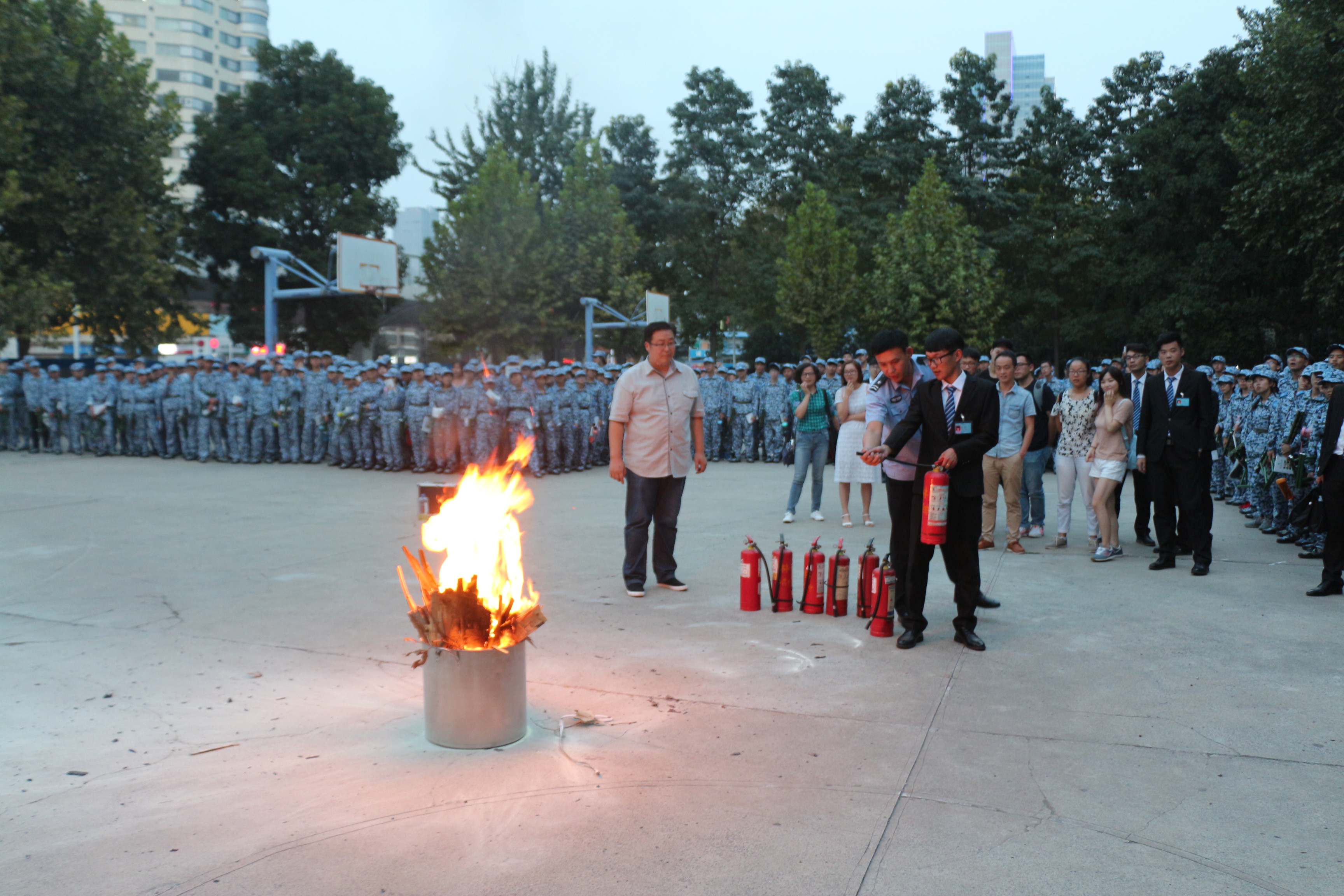 来自河南省安居防火宣传中心的特级教员韩鹏,结合自己从事消防培训工作多年的经验,用生动幽默的语言,深入浅出的讲述了容易引发火灾的消防安全隐患、遭遇火情紧急情况时的处置方法等问题。他表示大学人员密集,宿舍、食堂、实验室、教室等公共场所是火灾易发点,因此,加强大学消防管理,提高学生及教师的消防意识和消防素质显得尤为重要。随后,韩教员带领同学们在东篮球场进行了消防灭火演练,向大家讲解了初期火灾灭火技能、火场逃生疏散,并现场演示、指导同学们正确使用灭火器,使同学们对如何正确使用灭火器、正确自救等消防知识有了较为深入的了解。