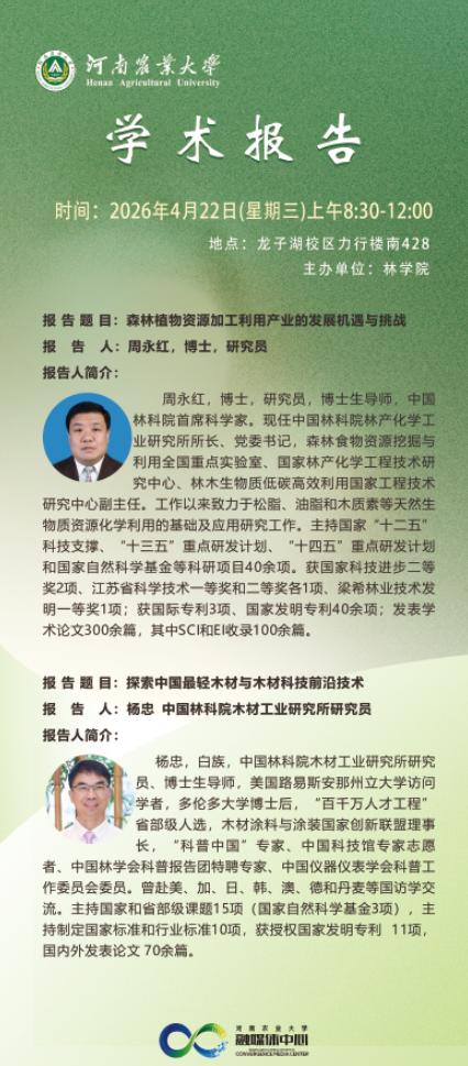报告人:杨忠, 博士,研究员,博士生导师,中国林业科学研究院